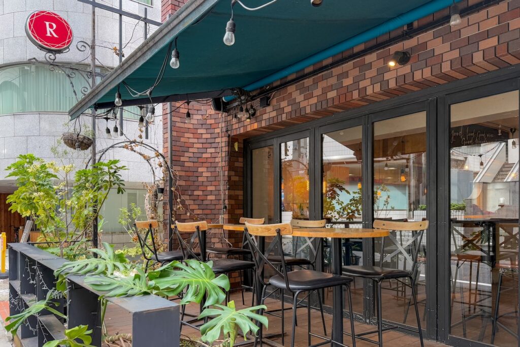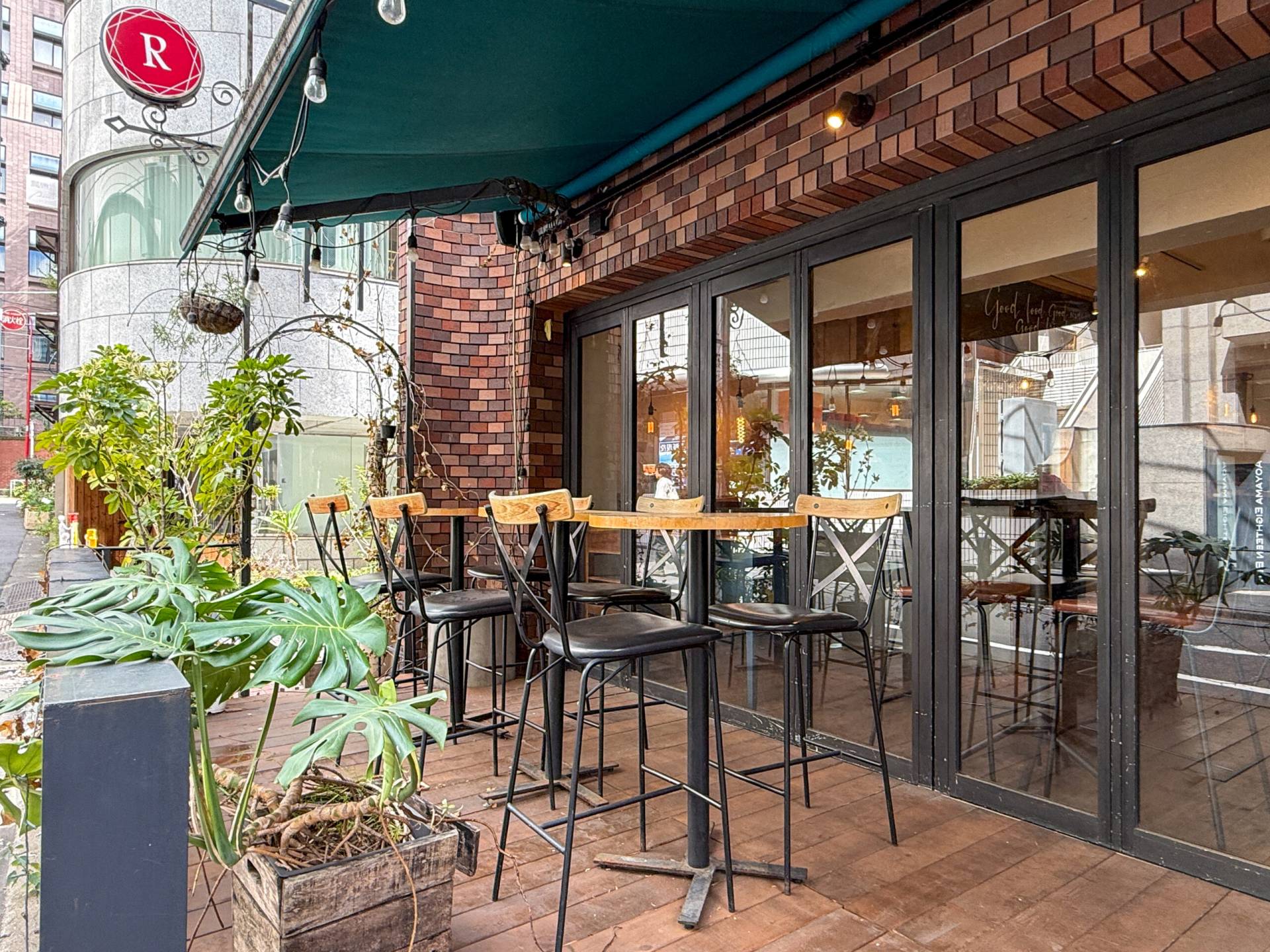 3. 十字路を左へ曲がった先、カフェテラスがあるレンガ壁のビルの1Fです。